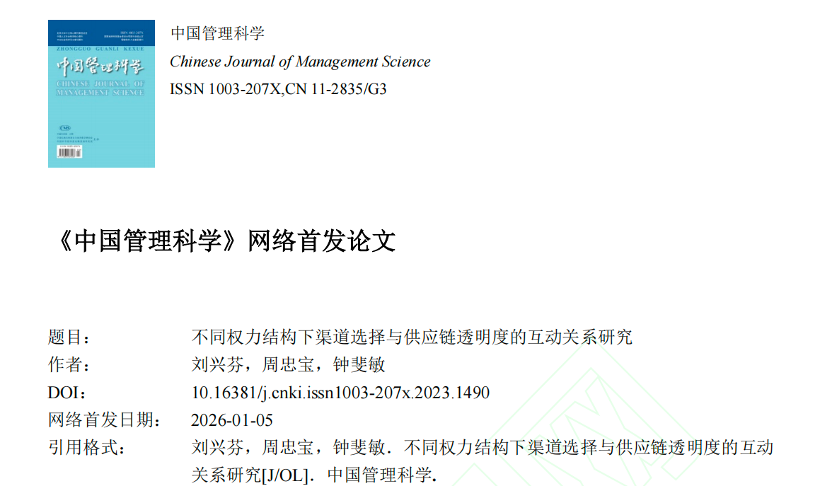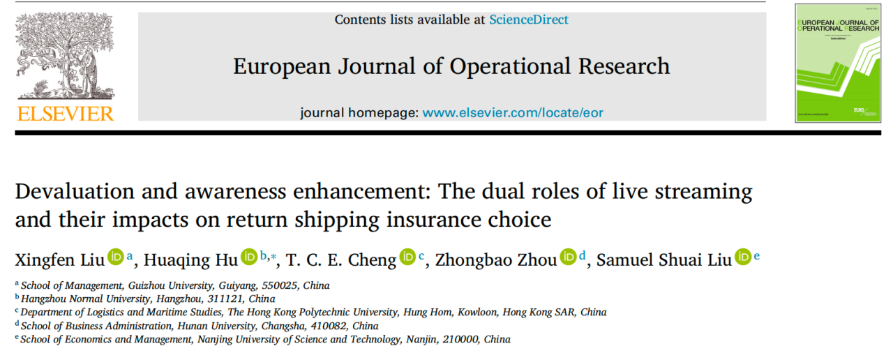 近日,贵州大学管理学院刘兴芬老师在运营管理与电子商务供应链领域取得重要进展,研究成果相继发表于《European Journal of Operational Research》(ABS 4级,FMS A类)与《中国管理科学》(A级重要期刊,影响因子9.58)等国内外权威期刊。合作单位包括香港理工大学、湖南大学、南京理工大学及杭州师范大学。系列成果是我校深化跨地域、跨机构协同创新的重要体现,充分彰显了学校在整合优质学术资源、推动实质性科研合作方面的显著成效。
