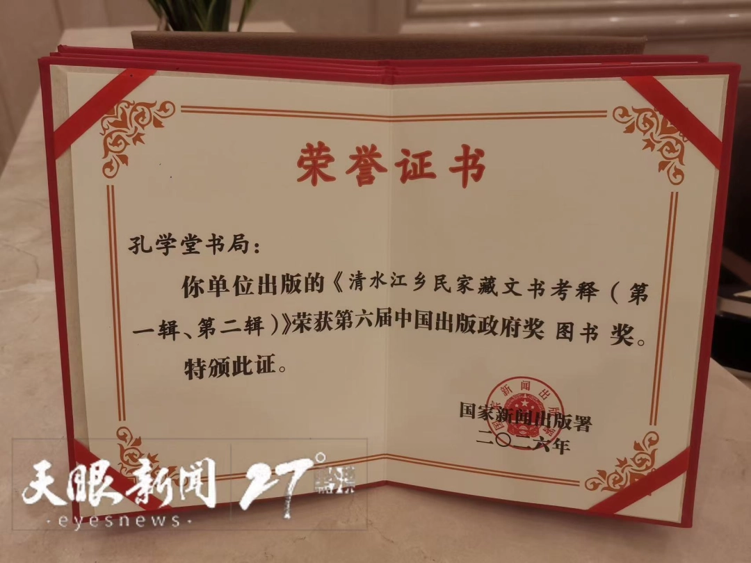 3月27日,第六届中国出版政府奖表彰座谈会在北京举行,由贵州大学中国文化书院荣誉院长张新民教授担任主编(首席专家)编纂、孔学堂书局出版的国家社科基金重大项目成果《清水江乡民家藏文书考释》斩获图书奖。
